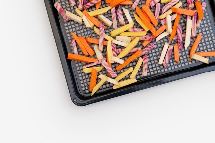 Bei der Zubereitung entscheidend ist das perforierte Blech oder besser noch ein Grillkorb. Darin sollten die Gemüsestäbchen alle nebeneinander, nicht übereinander liegen. Falls Sie auf der Suche nach einem neuen Backofen sind, der das besonders gut kann – fragen Sie uns!