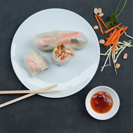 Mögliche Zutaten sind Karotten, Gurken, Eisbergsalat, Koriandergrün, gegarte Glas- oder Reisnudeln, Kohlrabi, Mango, Erdnüsse, Sprossen, Koriandergrün, Schafskäse ... Genauso gut passen auch Hähnchenfleisch, Lachs oder Shrimps – jeweils vorgegart. Als Dips eignen sich Sojasauce, süße Chilisauce, Sesamsauce oder eine Erdnusssauce.