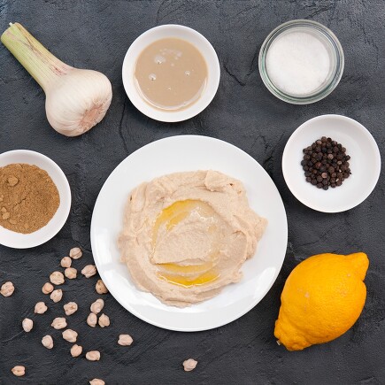 Nehmen Sie den Inhalt von zwei Dosen Kichererbsen und pürieren Sie diese. Währenddessen geben Sie 4 Esslöffel Tahini (Sesampaste, gibt es mittlerweile in gut sortierten Supermärkten), 4 Esslöffel Zitronensaft einen Schuss Olivenöl und zwei Knoblauchzehen dazu und pürieren Sie alles ganz fein. Das war es eigentlich auch schon – Sie können den Hummus noch mit Salz, Pfeffer, Kreuzkümmel oder Chili würzen, wenn Sie wollen. Decken Sie die Paste ab und lassen Sie sie 30 Minuten ruhen. Im Kühlschrank hält Hummus einige Tage.